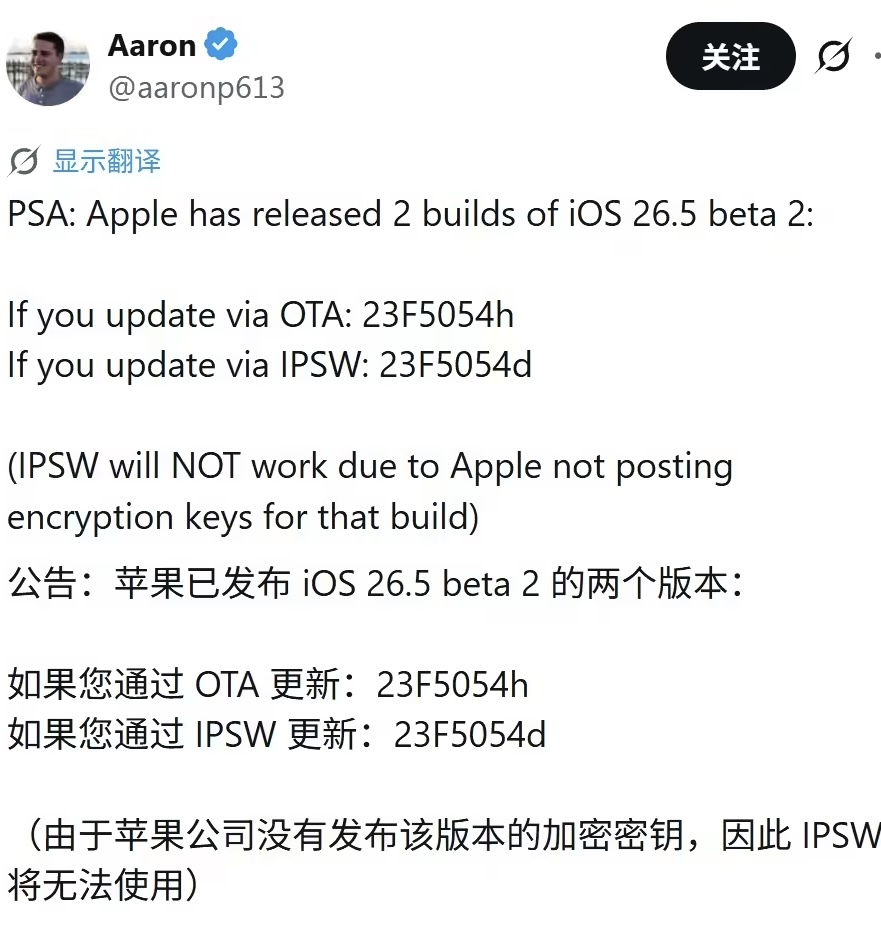 本次iOS 26.5 Beta 2共有2个内部版本号,如果用户通过OTA方式升级,升级的版本号为23F5054h;如果用户通过IPSW方式升级,则版本号升至23F5054d。
