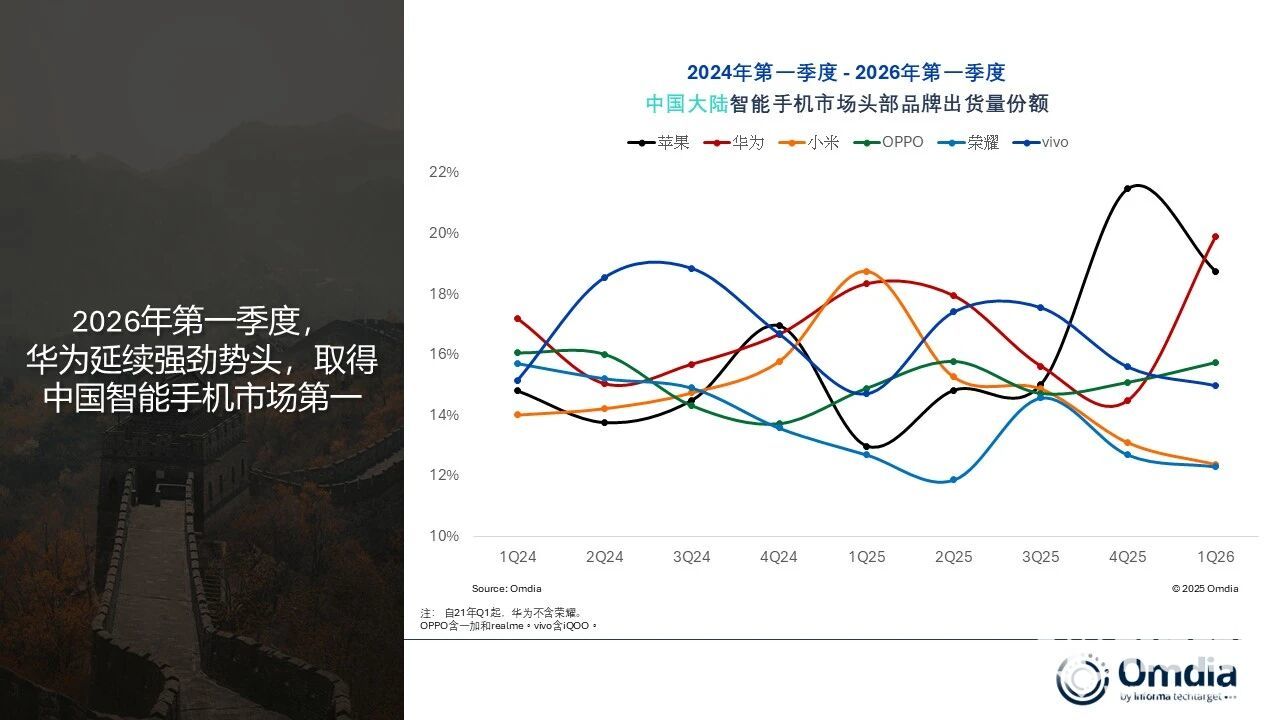 报告显示,华为、苹果、小米、OPPO、vivo、荣耀这六大品牌已占据整体市场94%的份额,在供应链、研发、生态构建等方面形成明显优势。然而,面对存储价格波动与AI技术快速演进,市场格局仍存变数。Omdia预计,2026年全年中国大陆智能手机市场可能呈现约10%的下行趋势。