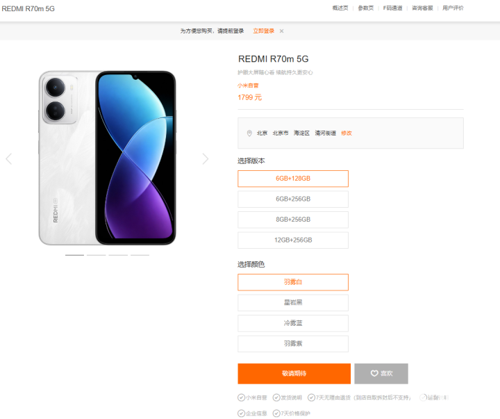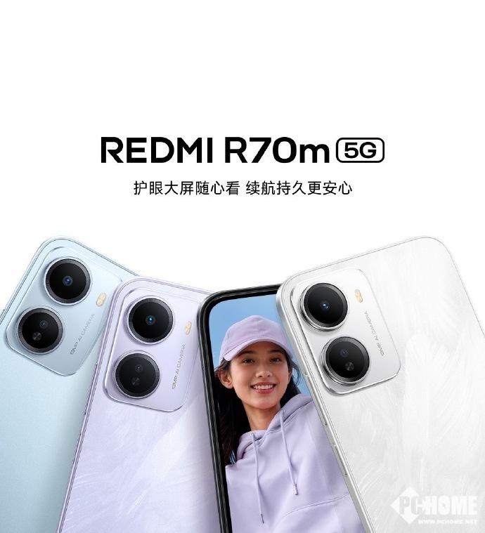 PChome 4月14日消息,今日,小米REDMI R70 5G与REDMI R70m 5G两款手机上架小米官网,两款手机均有羽雾白、星岩黑、冷雾蓝、羽雾紫4款配色可选,目前暂未开售,并显示敬请期待。