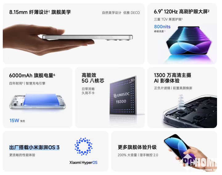 全系均搭载紫光展锐T8300芯片,并采用6nm工艺;搭载2×A78+6×A55为架构;GPU则为Mali-G57。性能介于骁龙695和天玑700之间,安兔兔跑分超72万,满足用户日常使用但游戏表现仍有限。主打长辈机或备用机场景。