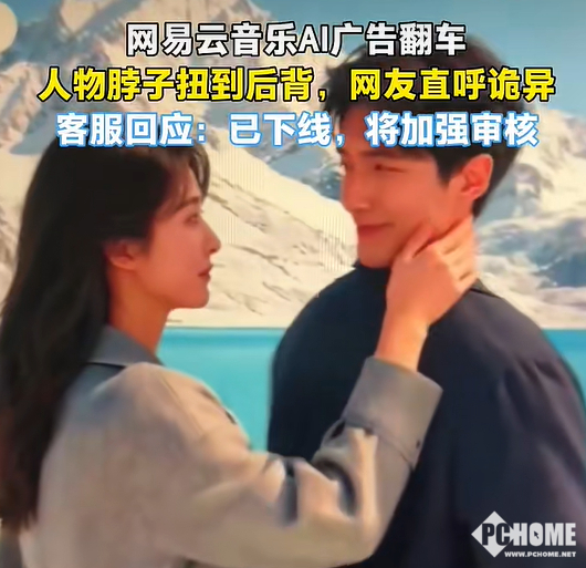 PChome 4月14日消息,近日网易云音乐一则AI生成的广告因画面诡异引发网友集体吐槽。据东方财经报道,4月12日有网友发帖吐槽“暂停爱奇艺时,广告中男主的脖子以极其不自然的角度旋转180°扭到背后,很吓人,网易云投放广告能不能严谨一点”,该广告在爱奇艺等平台播放时未标注“AI生成”,迅速在社交平台引发热议。