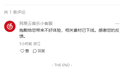 4月14日,网易云音乐相关负责人向南都N视频记者表示“抱歉给用户带来不好体验,相关素材已下线。”此前“网易云音乐小客服”已在微博、小红书等各大平台的评论区致歉,表示会将用户反馈转达给相关部门,并承诺加强审核。