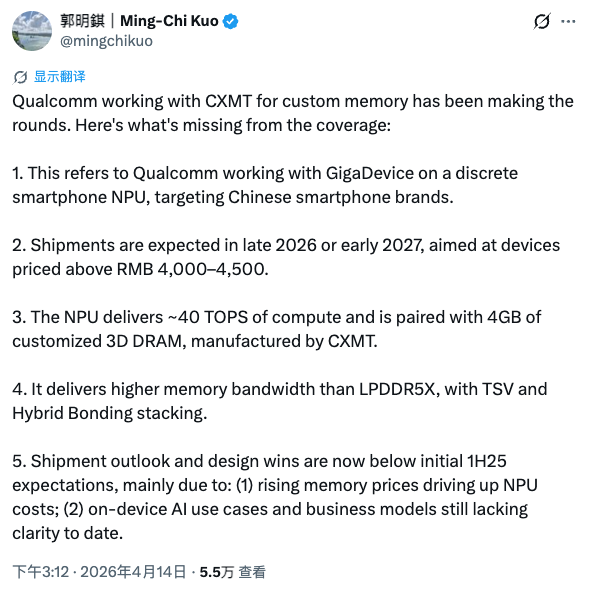 PChome 4月14日消息,知名苹果分析师郭明錤最新爆料,高通正联合兆易创新、长鑫存储,为中国手机厂商打造一款独立智能手机NPU,核心算力可达40 TOPS,预计2026年底至2027年初正式出货。