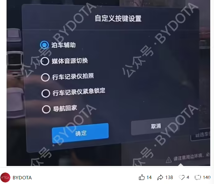 PChome 4月14日消息,今日,据BYDOTA透露,比亚迪针对DiLink 100智能座舱车型的五视角行车记录仪及哨兵风险视频上传相关功能的适配工作已接近尾声。