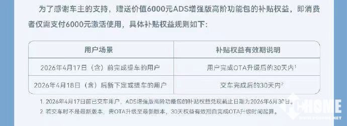依据官方发布的规则,2026年4月17日前完成提车的用户,可在完成OTA升级后的30天内享有该权益,兑换截止日期为2026年6月30日;4月18日后新下定或者提车的用户,权益有效期为交车后的30天,逾期将视为自动放弃。