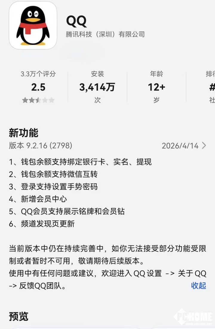 PChome 4月14日消息,今日,QQ鸿蒙版App在华为应用市场推送了9.2.16正式版本升级,带来了钱包余额支持绑定银行卡、实名、提现,登录支持设置手势密码等功能。