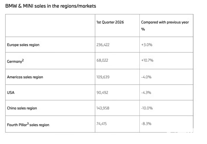 PChome 4月14日消息,宝马集团发布2026年一季度全球销量数据,全球共交付宝马、MINI、劳斯莱斯三品牌汽车565,748辆,同比下滑3.5%。