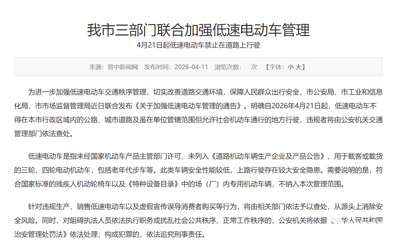 PChome 4月14日消息,山西晋中市公安局、工信局、市场监管局联合发布通告,明确2026年4月21日起,未经工信部许可、未列入机动车产品公告的三轮、四轮电动“老头乐”,禁止在市域内公路、城市道路及允许社会机动车通行的内部道路行驶,有效期3年。
