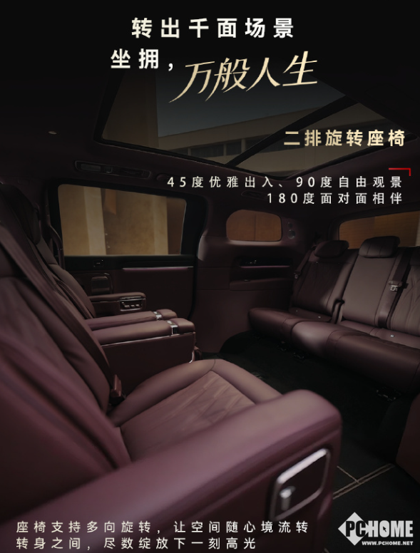 车内座椅采用诺贝尔化学奖MOFs材料,实现10分钟内可净化PM2.5/甲醛等污染物,并搭配UVC抗菌滤芯与车载制氧机,实现"会呼吸的座舱"。其二排支持45°迎宾旋转、90°观景模式及180°对坐模式,三种模式随意切换。而联动三排可秒变"移动会客厅",配备双零重力座椅+1.05米超长腿托,又可一键切换太空舒躺模式。