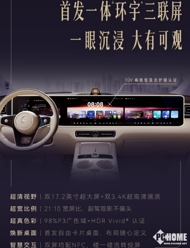 此外,该车将首发智能交互式侧门光毯及DLP智慧投影大灯,可支持自定义灯语,同时搭配一体环宇三联屏,包括双17.2英寸3.4K屏。为用户带来全新沉浸体验。