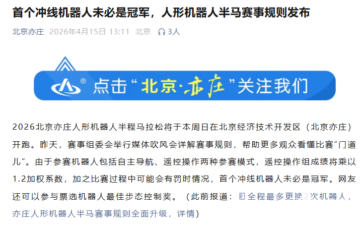 PChome 4月15日消息,今天午间,据“北京亦庄”公众号获悉,2026北京亦庄人形机器人半程马拉松将于本周日在北京经济技术开发区(北京亦庄)开跑。昨天,赛事组委会举行媒体吹风会已详解赛事规则,帮助更多观众了解比赛章程。