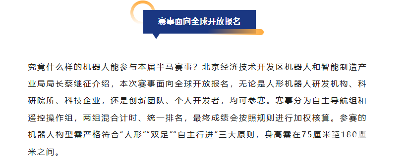 此外,北京经济技术开发区机器人和智能制造产业局局长蔡继征对于“究竟什么样的机器人能参与本届半马赛事”作出回应介绍,本次赛事面向全球开放报名,无论是人形机器人研发机构、科研院所、科技企业,还是创新团队、个人开发者,均可参赛。赛事分为自主导航组和遥控操作组,两组混合计时、统一排名,最终成绩会按照规则进行加权核算。参赛的机器人构型需严格符合“人形”“双足”“自主行进”三大原则,身高需在75厘米至180厘米之间。