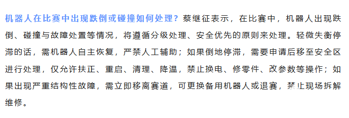 在比赛中,机器人如出现跌倒、碰撞与故障处置等情况,将遵循分级处理、安全优先的原则来处理。轻微失衡停滞需机器人自主恢复,并严禁人工辅助;如倒地停滞,需要申请后移至安全区进行处理,仅允许扶正、重启、清理、降温,禁止换电、修零件、改参数等操作;如出现更严重多结构性故障,需立即移离赛道,可更换备用机器人或退赛,禁止现场进行拆解维修。