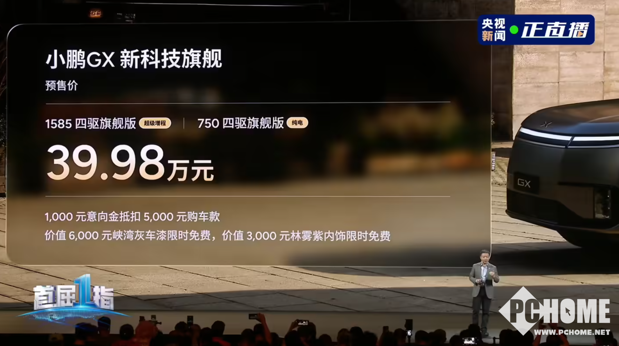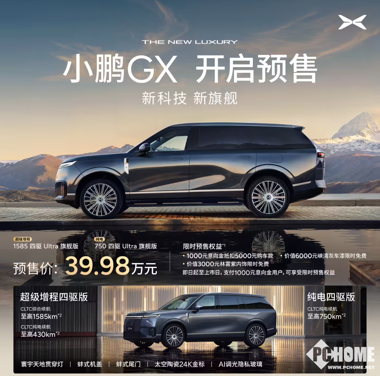 PChome 4月15日消息,小鹏汽车旗下首款全尺寸旗舰SUV——小鹏GX正式开启预售,预售价39.98万元,推出纯电四驱与超级增程四驱两款车型。新车基于SEPA 3.0物理AI架构打造,定位AI新豪华大六座。