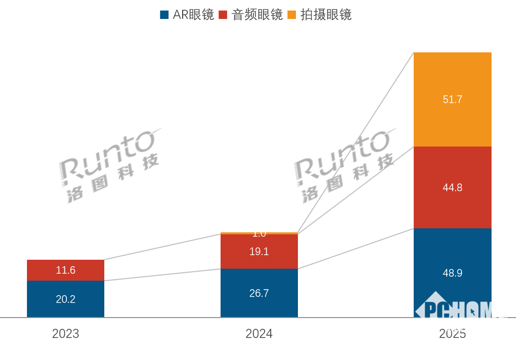 报告将智能眼镜划分为AR眼镜、音频眼镜和拍摄眼镜三大品类。2025年,三类产品呈现齐头并进的增长格局。其中,拍摄眼镜表现最为亮眼,市场规模从近乎空白猛增至51.7万台,主要得益于Vlog创作、户外运动记录等场景的兴起。音频眼镜销售44.8万台,同比增长134.6%;AR眼镜销售48.9万台,同比增长83.2%,各细分市场均已形成稳定的用户群体。