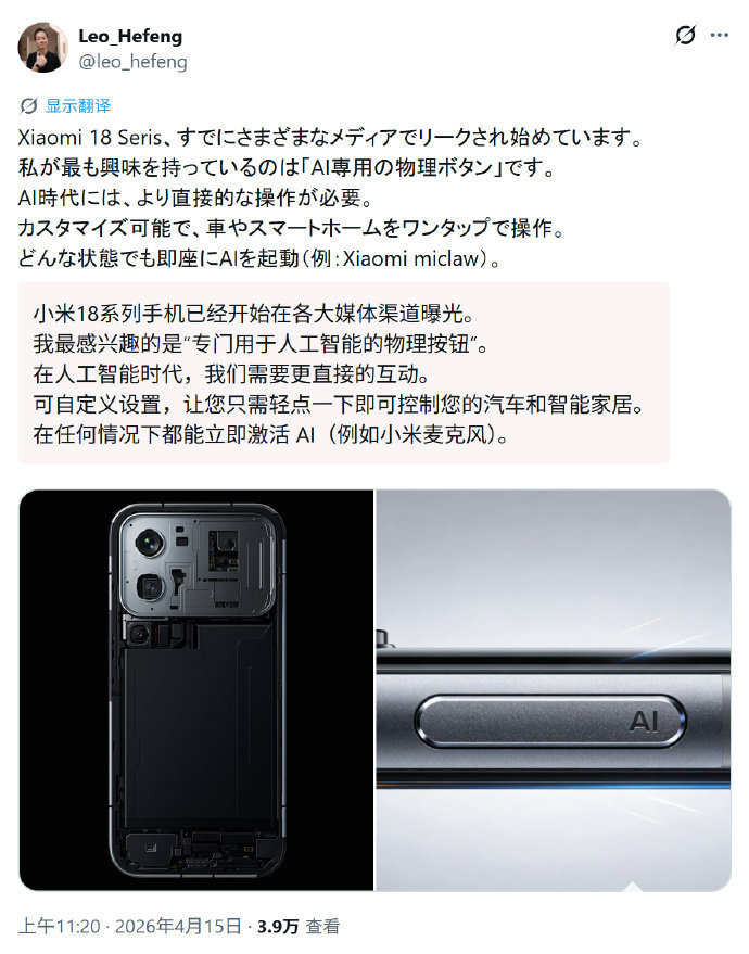 消息源@leo_hefeng发布的图片显示,小米18 Pro在外观设计上延续了前代小米17 Pro的风格,背部保留了标志性的三摄布局与后置副屏。然而,机身侧边新增的物理AI按键尤为引人注目。据悉,该按键支持用户自定义功能,目的是在实现一键快速启动AI应用,并能便捷地控制智能家居设备,甚至与小米汽车进行联动,预示着其在小米“人车家全生态”战略中将扮演重要角色。