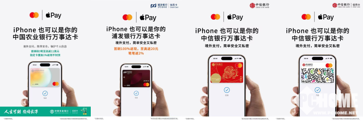 PChome 4月16日消息,万事达卡联合境内银行卡清算机构万事网联正式宣布,中国境内发行的万事达卡品牌银行卡全面支持Apple Pay跨境交易支付,借记卡与信用卡均可使用。