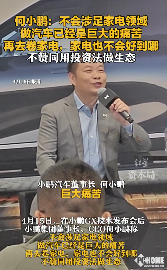 PChome 4月16日消息,小鹏昨晚举行小鹏GX技术发布会,首款全尺寸旗舰SUV车型GX开启预售,小鹏集团董事长、CEO何小鹏称做汽车已经是一个巨大的痛苦,目前没有想法涉足家电领域。