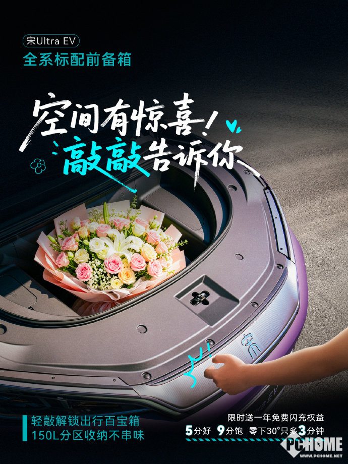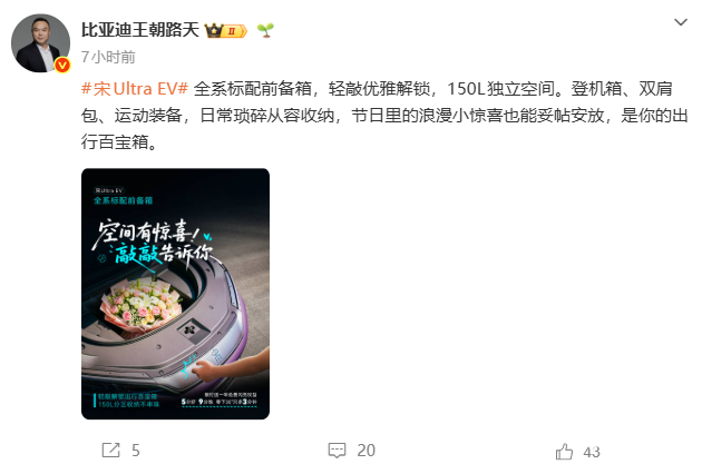 PChome 4月16日消息,今日,比亚迪王朝网销售事业部总经理路天发布博文称,宋Ultra EV全系标配前备箱,轻敲可优雅解锁,拥有150L独立空间。并表示登机箱、双肩包、运动装备,日常琐碎从容收纳,节日里的浪漫小惊喜也能妥帖安放,是用户的出行百宝箱。