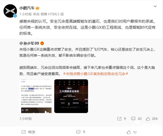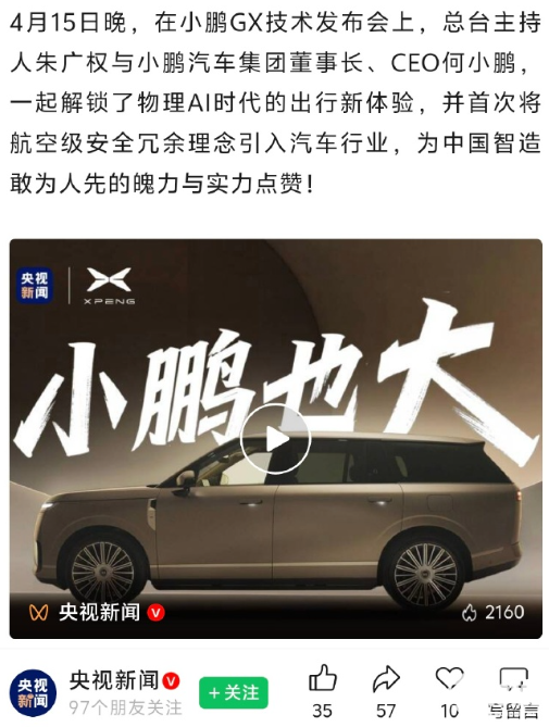PChome 4月16日消息,今日,小鹏汽车感谢央视点赞小鹏GX“安全冗余”这一报道并称:安全冗余是高端智能车的基石,也是小鹏汽车对用户最根本的承诺。随后表示这是小鹏GX的工程底线,也是智能时代应有的标准。