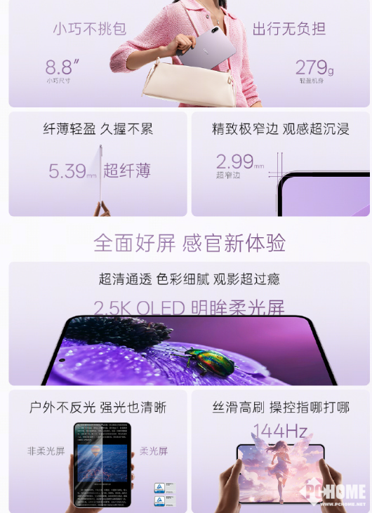 其机身重量仅279g,厚度为5.39mm,采用3:2屏幕比例,提供深空灰、薄荷青、莫奈紫三款配色,兼顾极致轻巧感并适合用户单手握持持。