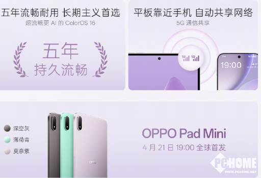 PChome 4月16日消息,今日,OPPO公布了OPPO Pad Mini的平板规格,将于4月21日19:00全球首发。