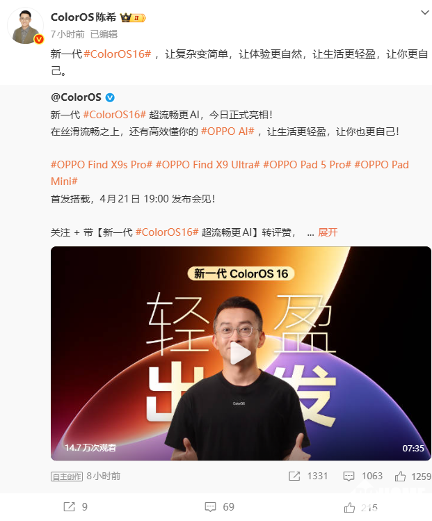 PChome 4月16日消息,今日,ColorOS设计总监公布了新一代OPPO ColorOS 16的亮点功能与升级计划。