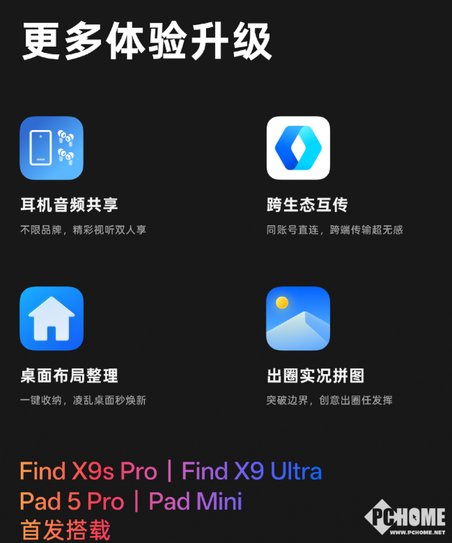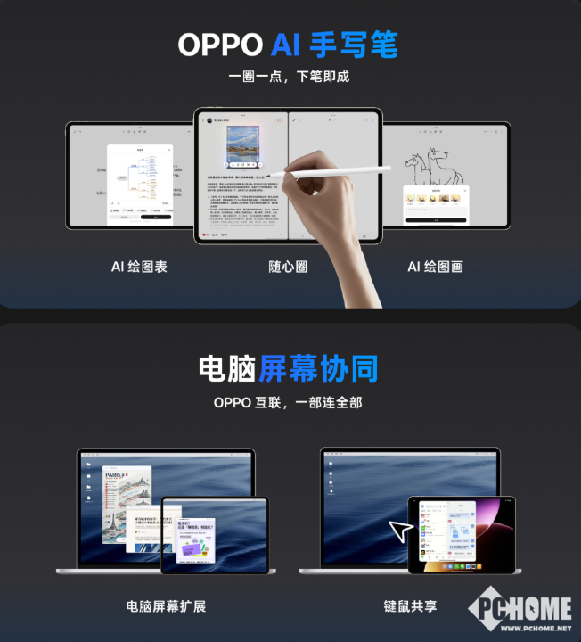 用户在工作/学习场景时,新版支持与iPhone跨生态互传,需用户提前安装“OPPO互联”App、电脑屏幕协同,实现扩展模式+键鼠共享、双耳机音频共享且音量可独立调节。此外,平板端将引入全景自由窗、OPPO AI手写笔支持草图转图表、文档提取、实况拼图出圈等创作功能,优化了大屏办公模式。