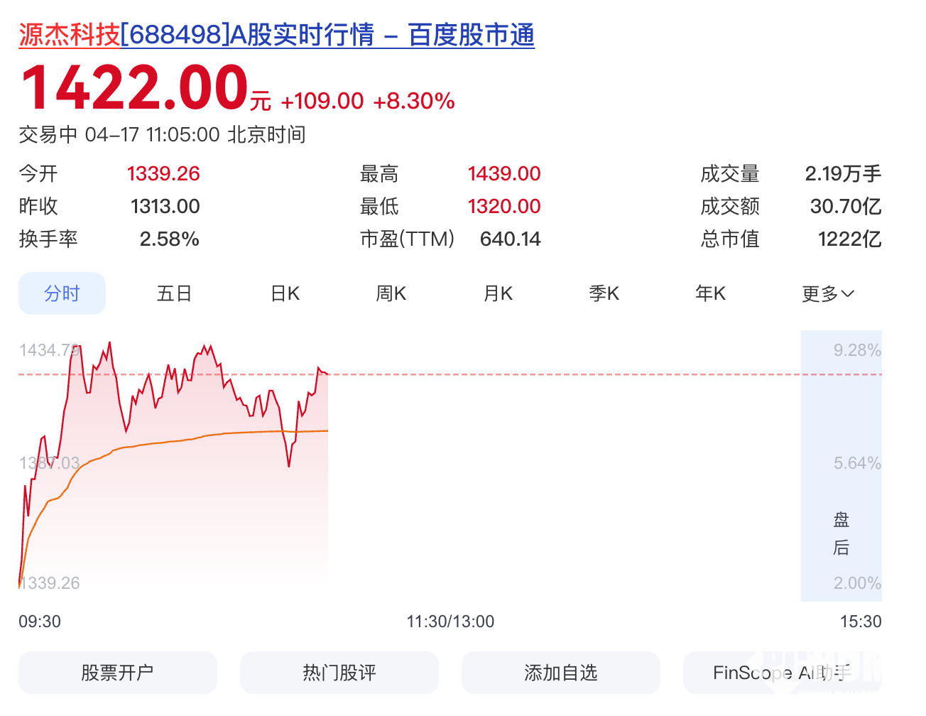 PChome 4月17日,源杰科技股价涨超8%,截至发稿报1422元/股,超越茅台的1405.6元/股,登顶A股“新股王”。不过源杰科技的市值仅为1222亿元,远不及茅台的1.76万亿元。