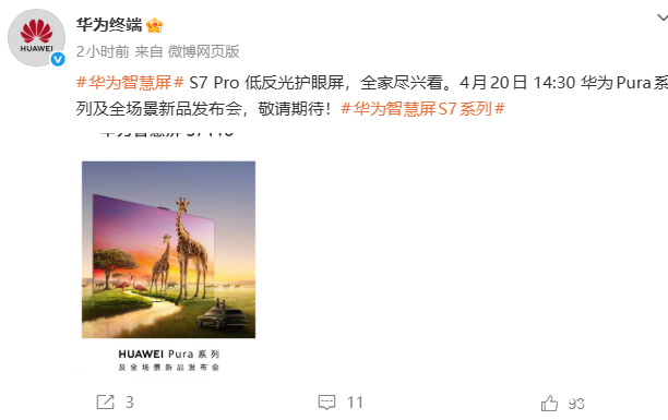 PChome 4月17日消息,今日,华为官方宣布,华为智慧屏S7 Pro将于4月20日14:30举行的华为Pura系列及全场景新品发布会上正式发布。