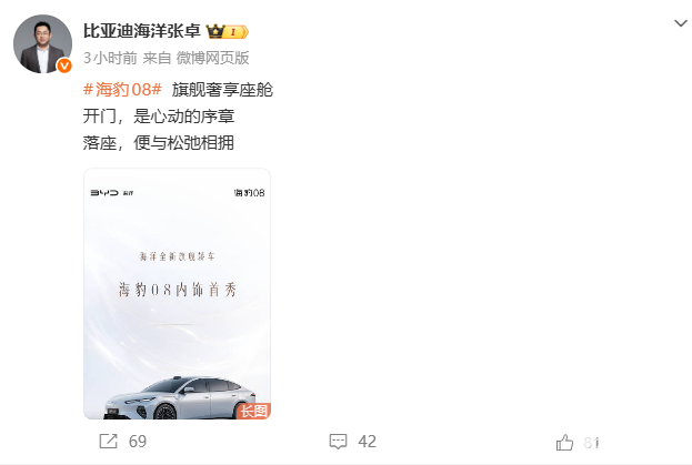 PChome 4月18日消息,今日,继4月15日公布了官图之后,比亚迪汽车海洋网销售事业部总经理张卓在下午又带来了海洋网旗舰轿车——海豹08的内饰细节及部分配置。