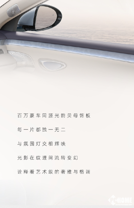此外,还将搭载15.6英寸中控屏、12.3英寸仪表盘与26英寸AR-HUD,形成三屏交互布局。中控台与门板嵌入“百万豪车同源”的光韵贝母饰板,每片纹理独一无二,配合氛围灯折射出珍珠般温润光泽。