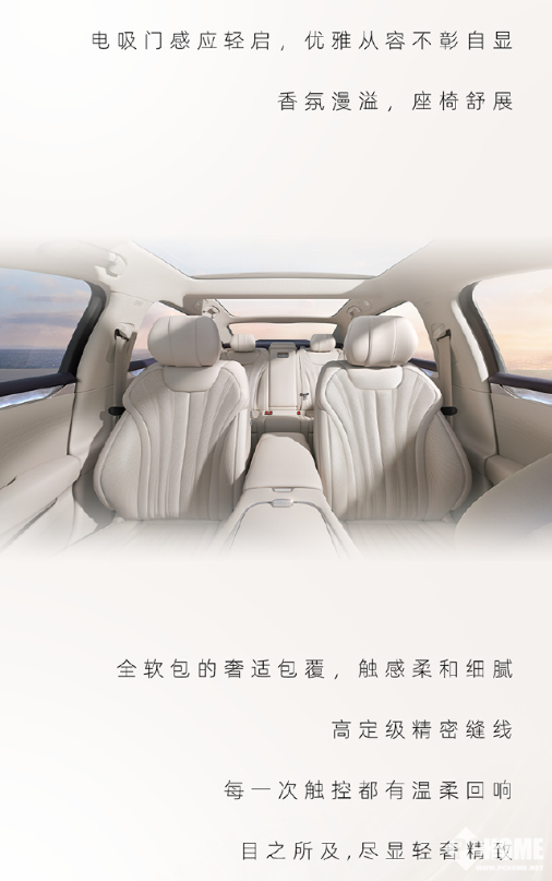 同时,主副驾均自带八向电动调节,后排标配全真皮座椅,具备通风、加热、按摩功能,并提供电动腿托、小桌板、隐藏式杯架及后排专属扶手屏,打造头等舱级体验。C柱采用无遮挡设计,结合超大分段式全景天幕,提升视野开阔感与采光效果。 兼顾用户舒适度与便捷性。