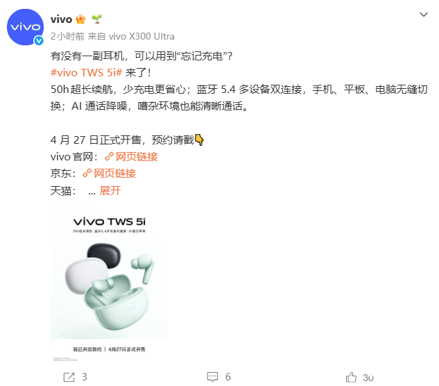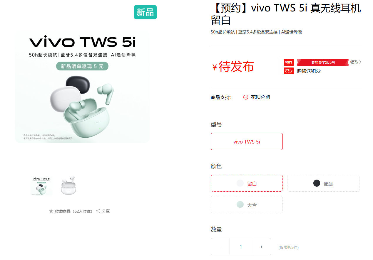 PChome 4月17日消息,今日,vivo官方宣布,vivo TWS 5i耳机开启预约,4月27日正式发售,但官方暂未公布这款耳机的价格。