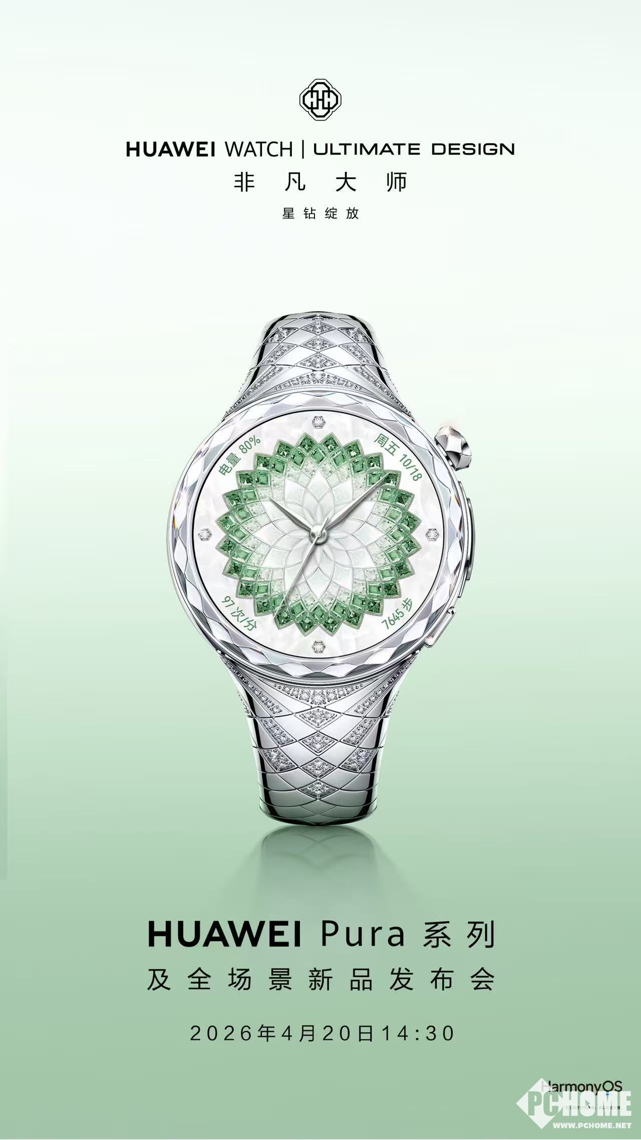 PChome 4月17日消息,华为终端正式官宣,将推出旗下首款珠宝智能腕表——华为WATCH ULTIMATE DESIGN非凡大师星钻绽放款。这款被誉为“星钻手镯表”的新品,将于4月20日举行的Pura系列及全场景新品发布会上正式亮相。