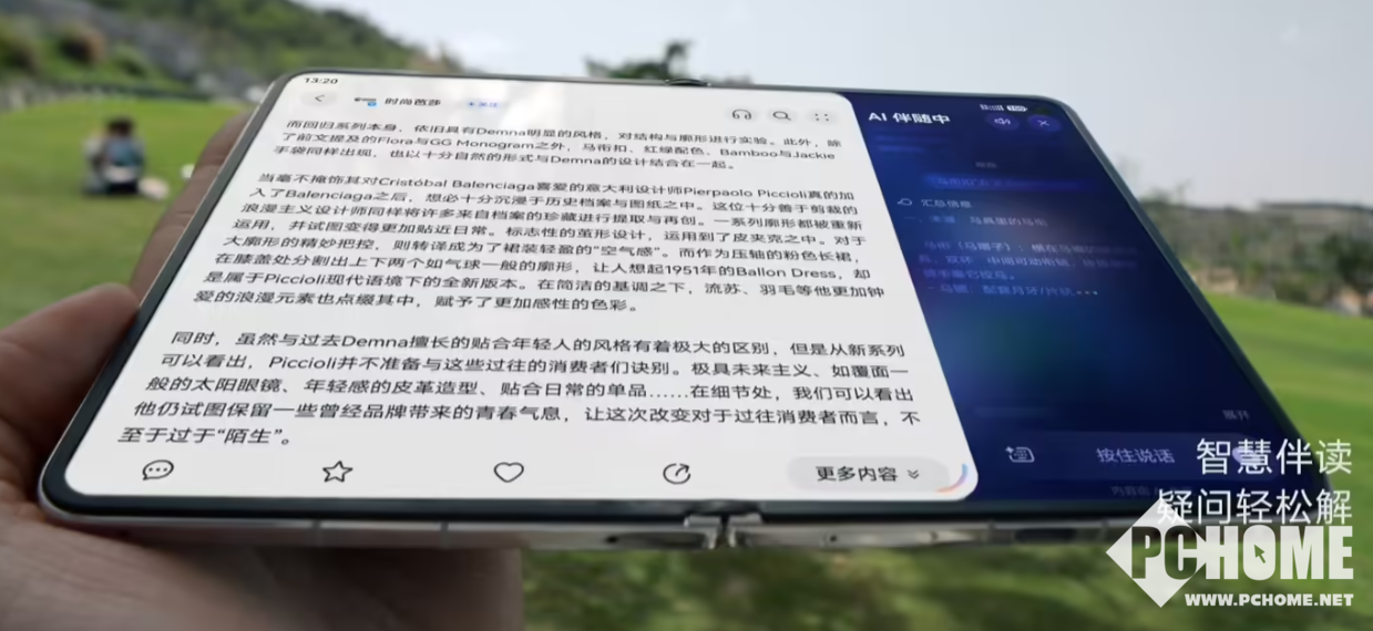智慧伴读可智能识别用户阅读内容,提供收藏、长文导读、总结、生成脑图等功能,则用户勾选的文字内容,小艺也可智能查询汇总相关信息;话题推荐可智能识别当前用户阅读内容,并提供相关话题讨论等;全局小艺则代表以上场景的主动伴随AI功能区均设有小艺语音按钮,并支持用户点击或按住说话。
