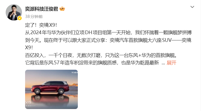 东风与华为联合打造的中高端智能化汽车品牌——奕境汽车,正式官宣其首款旗舰大六座SUV命名为“奕境X9”。
