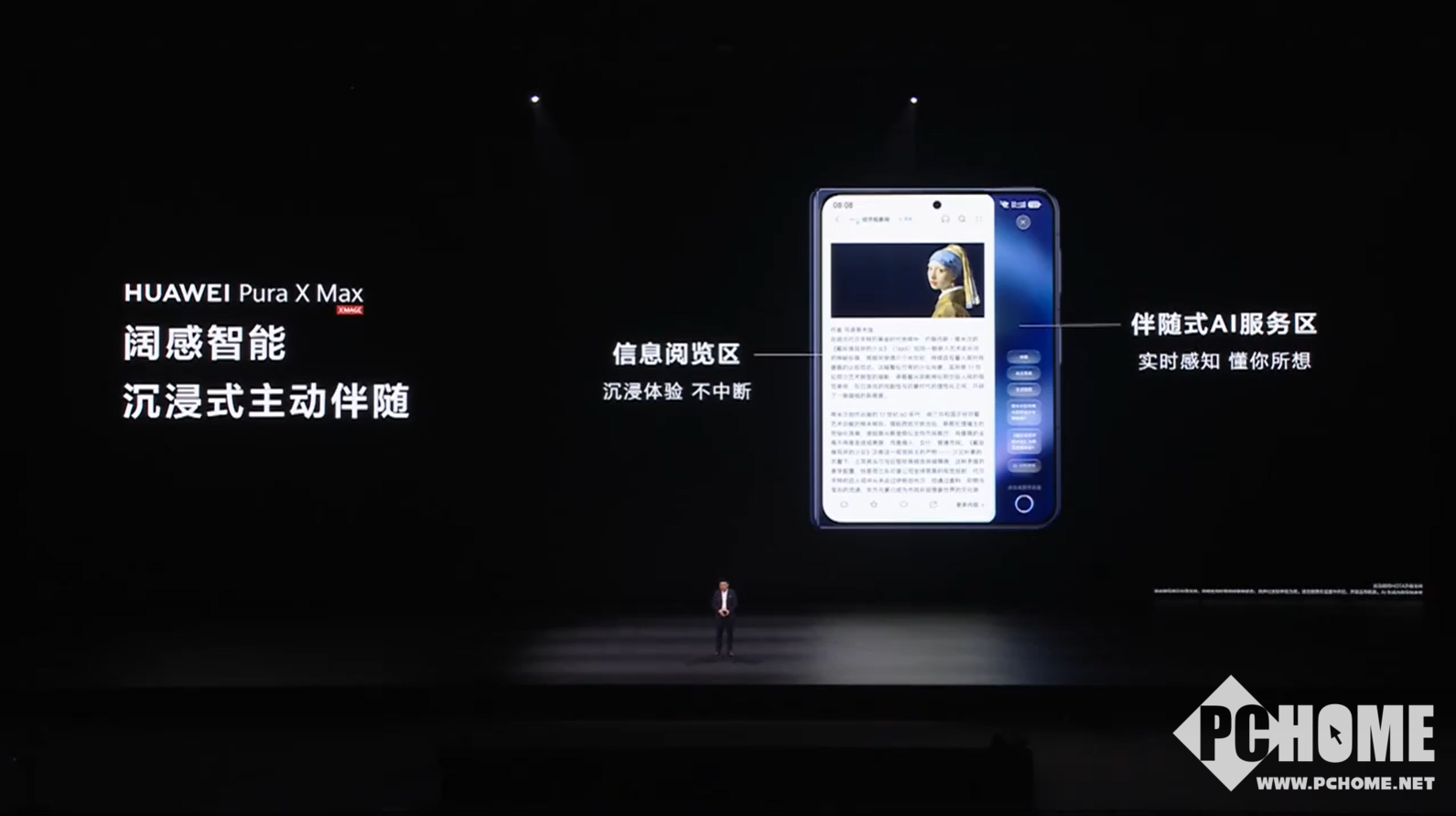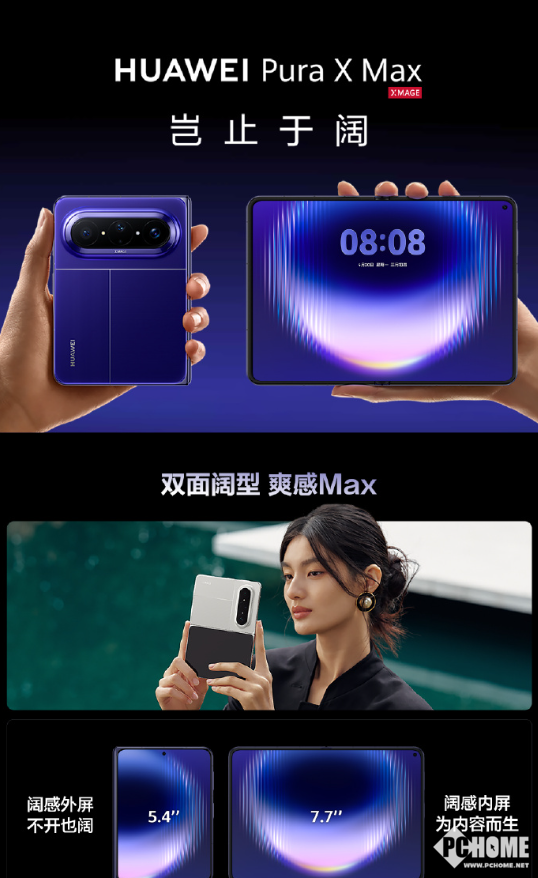 PChome 4月20日消息,华为Pura X Max系列于今日的华为Pura系列及全场景新品发布会上正式发布,定位为全球首款大阔折旗舰手机,主打“双面阔型屏”设计,实现折叠前后视觉体验一致。兼顾影音、阅读、办公等多场景沉浸感。