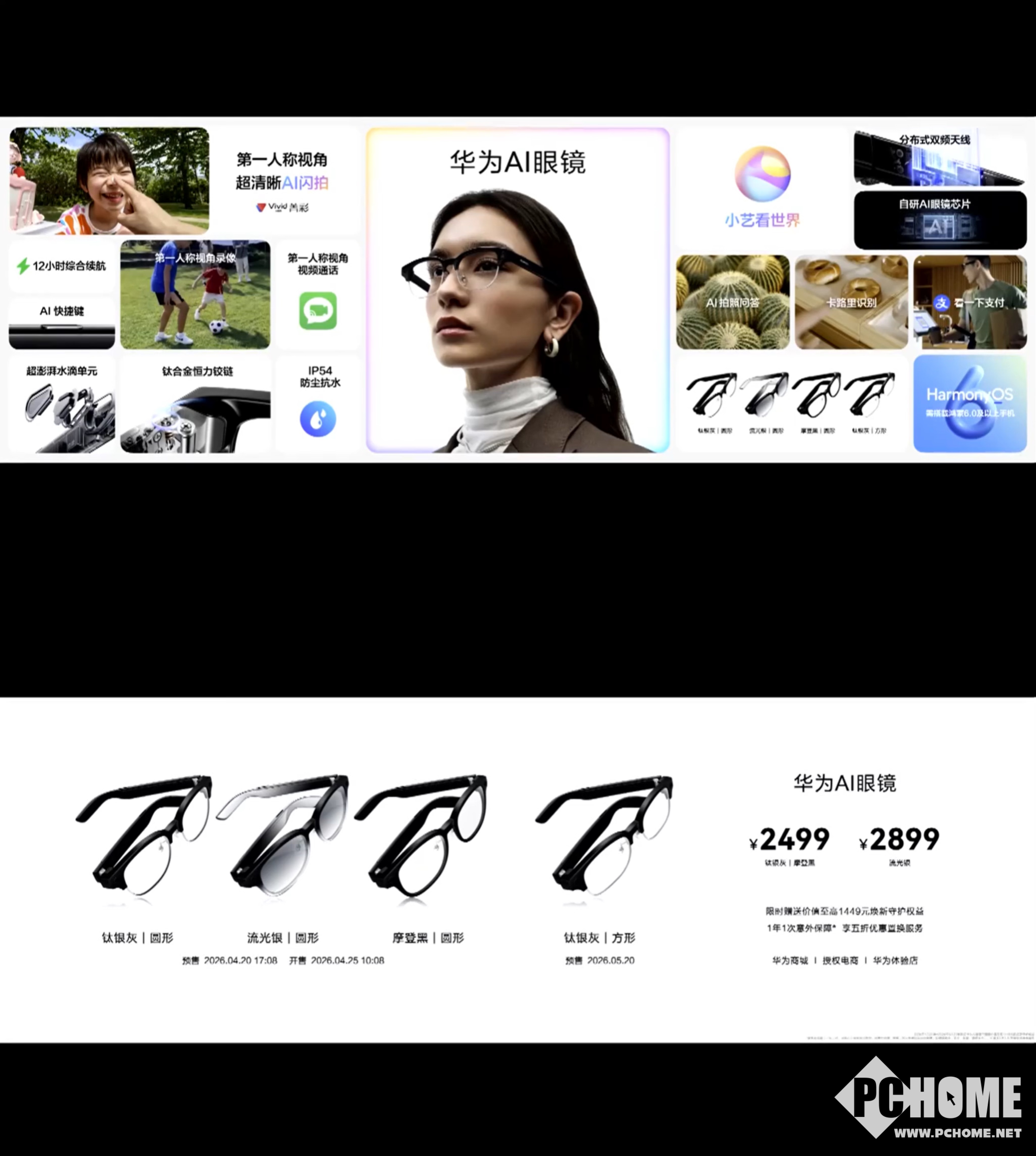 PChome 4月20日消息,华为于今日在产品发布会上正式发布华为首款鸿蒙AI眼镜,售价2499元起,标志着华为正式切入AI眼镜赛道。这款眼镜搭载1200万超感光摄像头,支持0.7s超清晰AI闪拍与AI构图矫正,可通过语音或快捷键一键唤醒拍摄,记录第一人称视角画面。