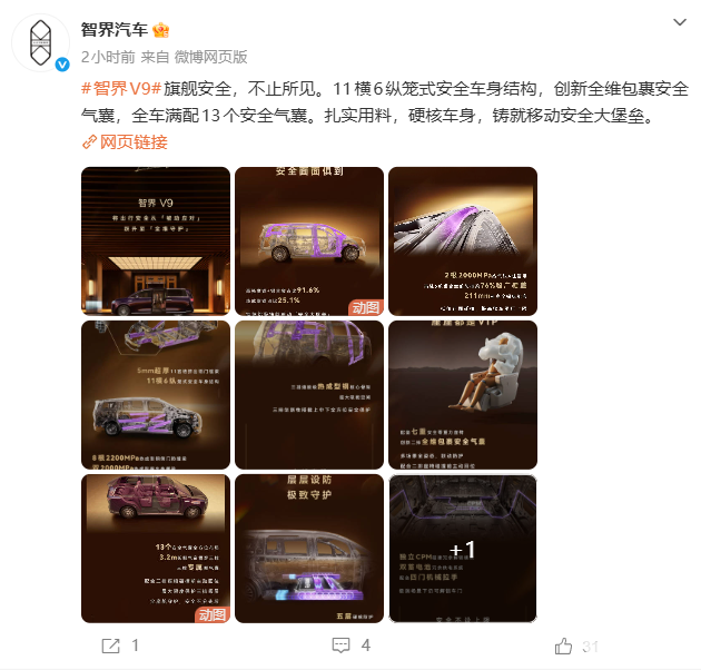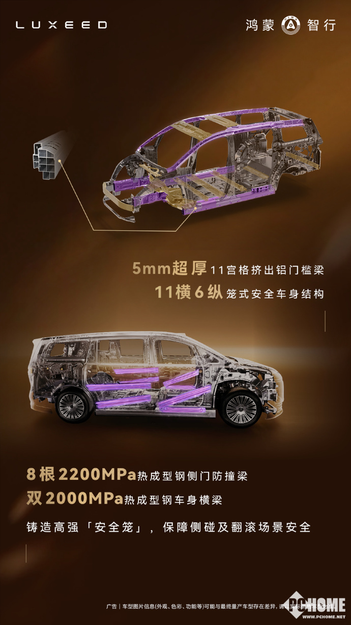 PChome 4月20日消息,今日,智界汽车公布了智界V9其全维安全白车身的技术细节。据官方介绍,该车型在车身结构设计上采用了11横6纵的布置方案,并搭载一体式热成型钢门环。