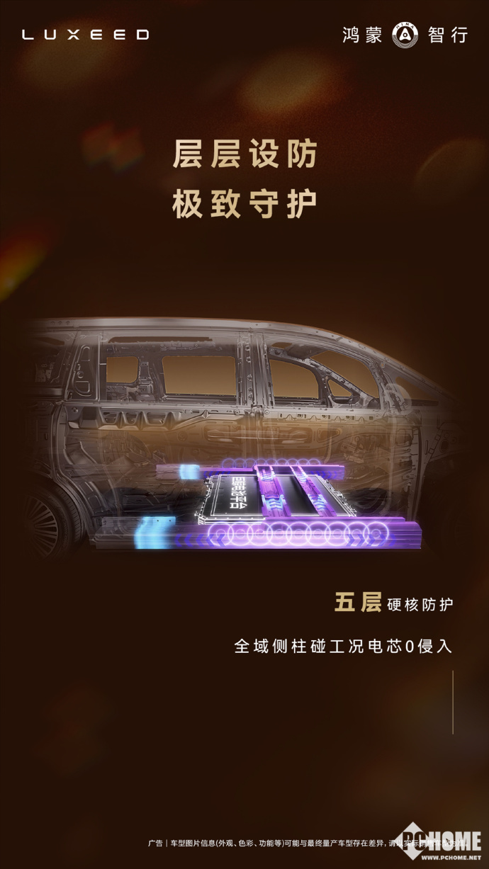 三电系统安全方面,智界V9搭载了华为巨鲸电池包。该电池包采用五重结构设计,实现了侧柱碰工况下电芯的零侵入。电芯本身具备五层安全包覆,并配备高压闪断保险开关,配合云端BMS系统进行监测,以确保动力系统的电气安全。