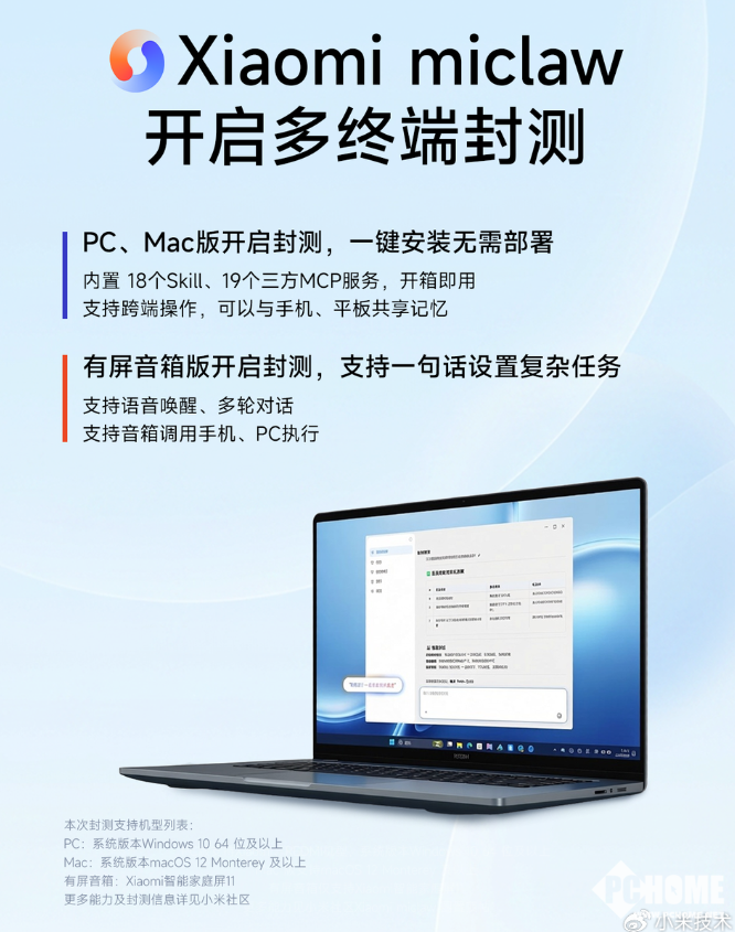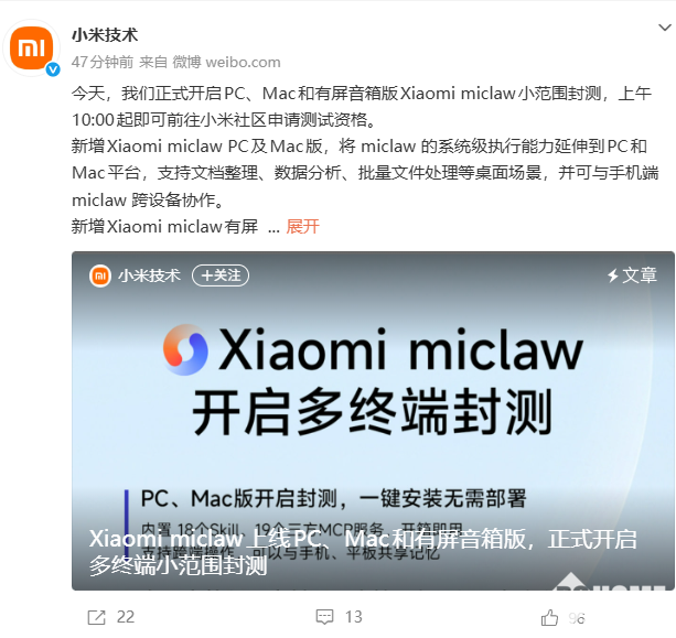 PChome 4月21日消息,今日,小米官宣开启PC、Mac和有屏音箱版Xiaomi miclaw小范围封测,于上午10:00起,用户即可前往小米社区申请测试资格。