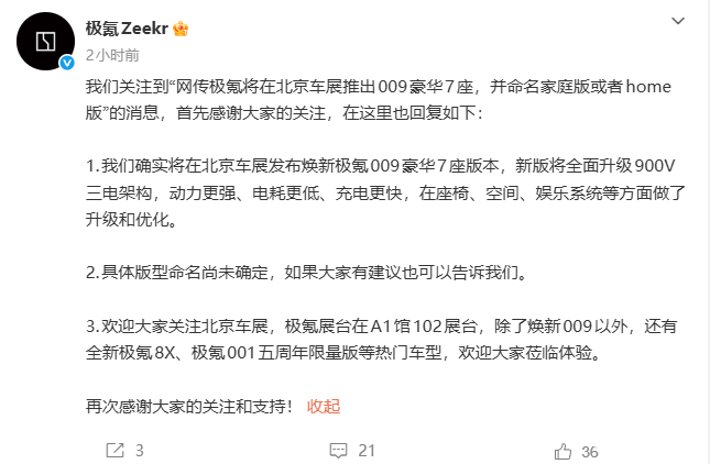 PChome 4月21日消息,今日,极氪官方发文称,关注到“网传极氪将在北京车展推出009豪华7座,并命名家庭版或者home版”的消息,并进行相关回复。