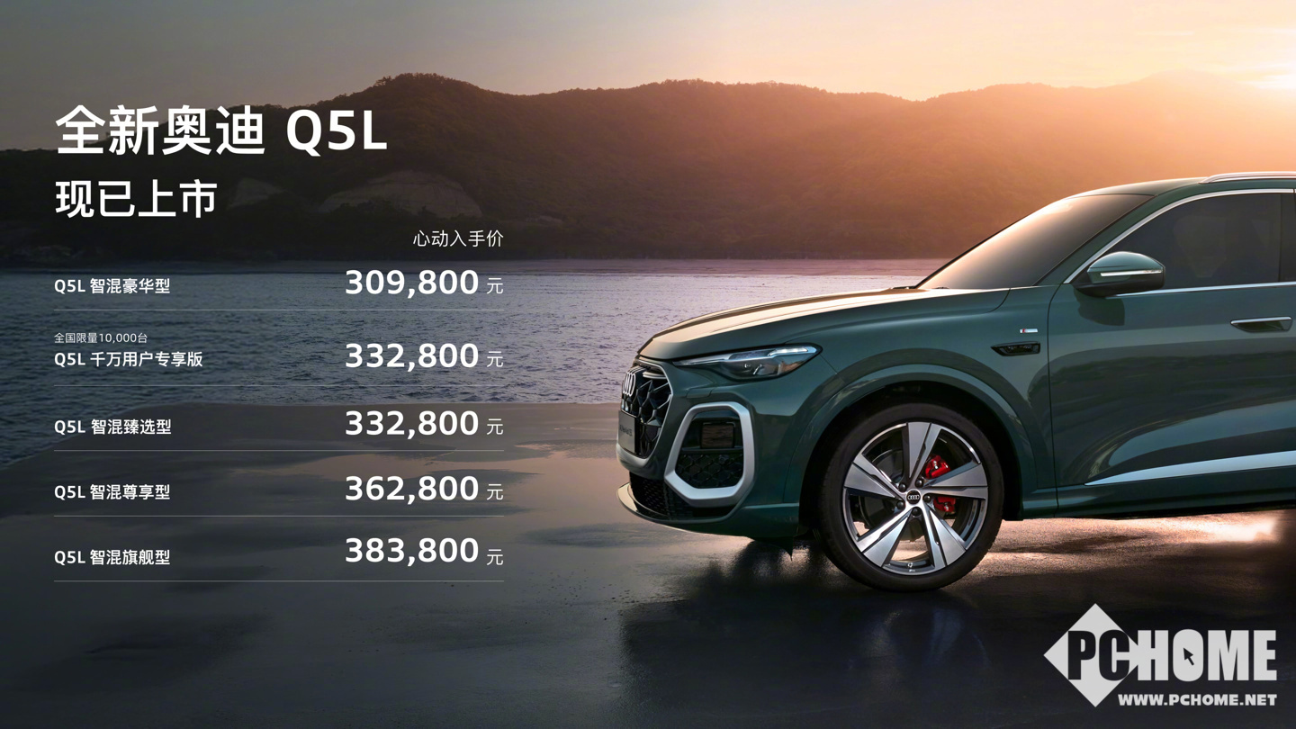 PChome 4月21日消息,全新奥迪Q5L智混臻选型于4月21日正式上市,官方指导价34.68万元,限时“心动入手价”仅33.28万元。新车最大亮点在于动力与智能的双重跃升:搭载第五代EA888 2.0T发动机,最大功率达200kW,零百加速仅需5.8秒,同时全系标配全域智混技术,兼顾了德系驾控与低油耗。