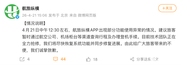 PChome 4月21日消息,航旅纵横官微发文称,4月21日中午12:30左右,航旅纵横App出现部分功能使用异常的情况。建议旅客暂时通过航空公司、机场柜台等渠道查询行程及办理登机手续。目前技术团队正在全力抢修,将尽快恢复系统功能并同步修复进展。由此给广大旅客带来的不便,诚挚致歉。