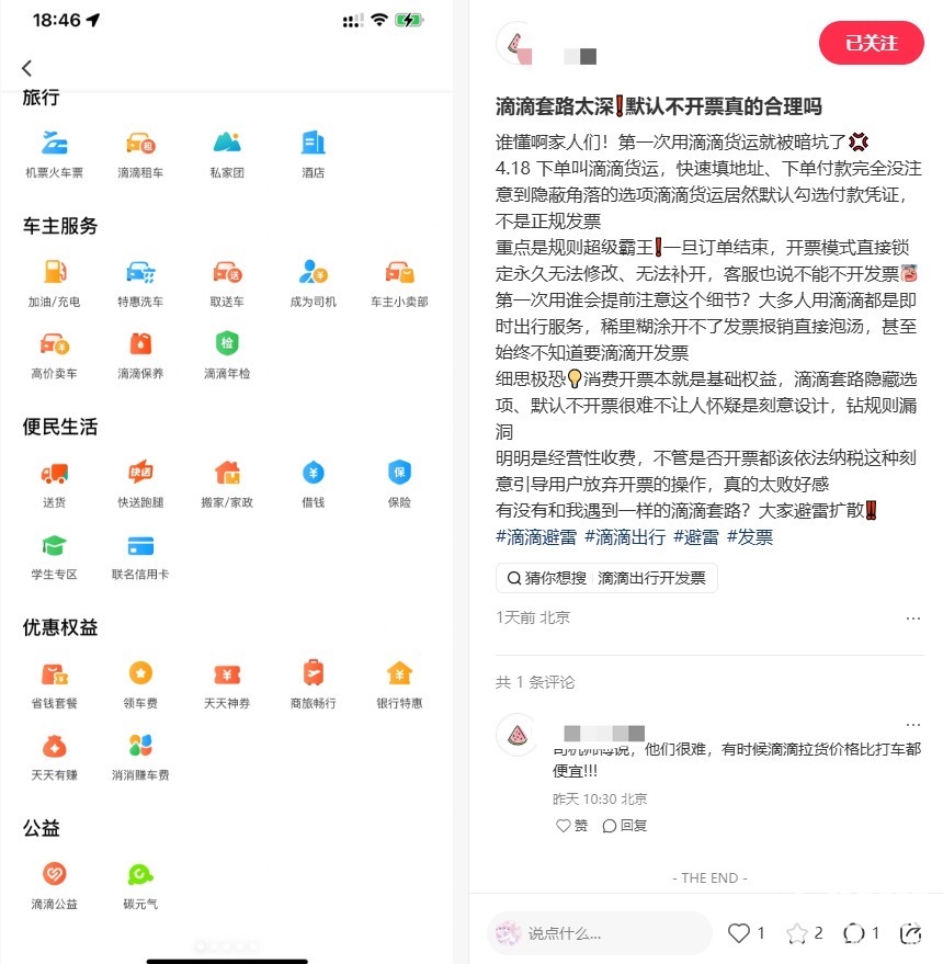 PChome 4月21日消息,近日,不少网友在小红书平台发帖吐槽滴滴出行App内“默认不勾选发票”。有用户反映,在使用“滴滴送货”服务,滴滴出行App的系统会默认不开发票,导致在需要报销时无法获得发票。即便用户发现开发票的操作方法,过程极为繁琐。滴滴客服表示,订单一旦结束,开票模式便无法再修改。