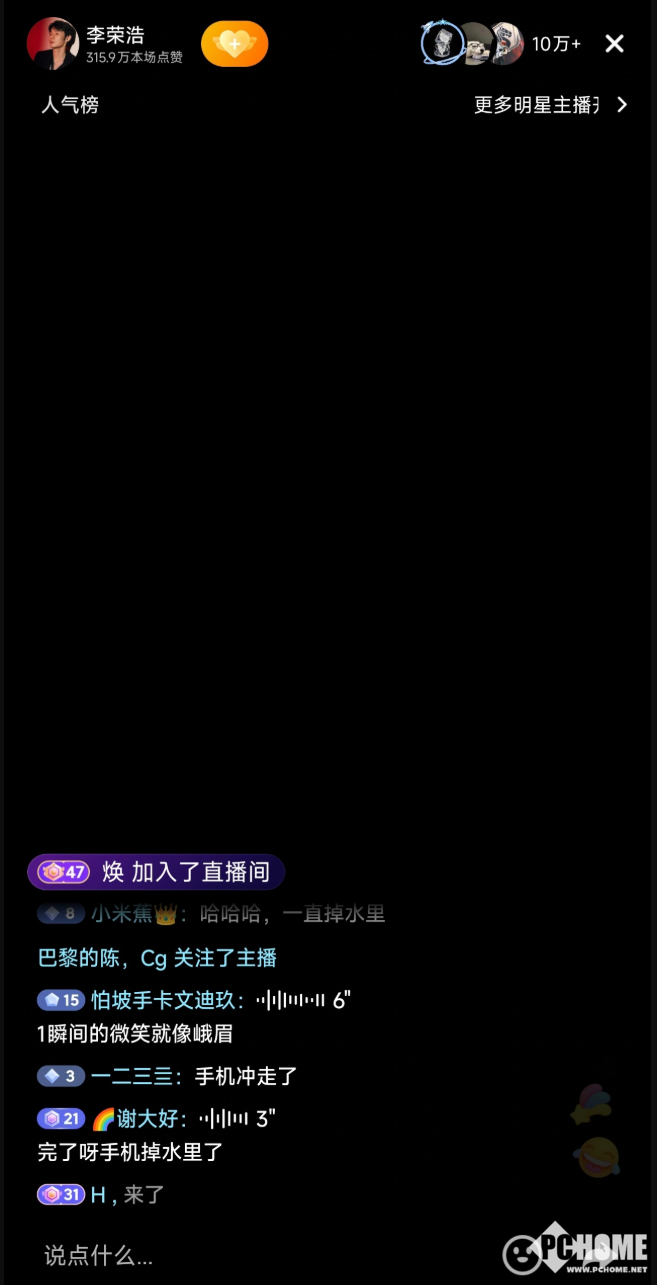 PChome 4月21日消息,歌手李荣浩在户外钓鱼直播时遭遇突发状况,手机不慎滑落水中,导致直播中断,超10万在线网友共同见证这一社死名场面。