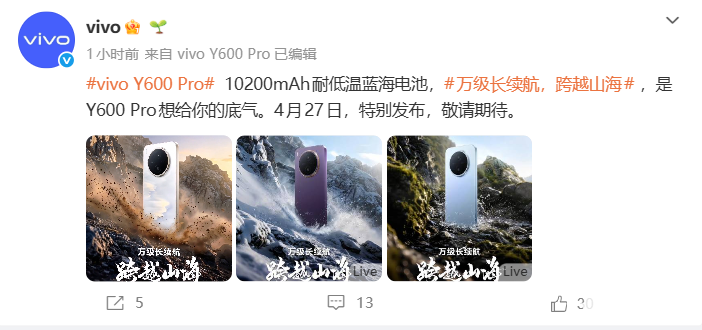 PChome 4月22日消息,vivo官宣vivo Y600 Pro手机将于4月27日正式发布,其最大亮点是搭载了10200mAh的耐低温蓝海电池,成为vivo史上电池容量最大的手机。
