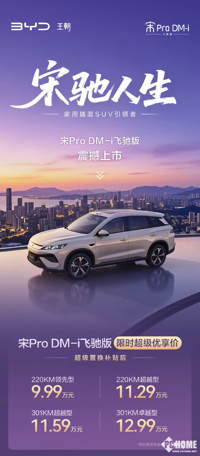 PChome 4月22日消息,比亚迪宋Pro DM-i飞驰版正式上市,新车共推出4款车型,限时超级优享价为9.99万元至12.99万元。此举将长纯电续航插混SUV的门槛首次拉入10万元以内,对市场格局形成强力冲击。