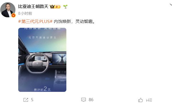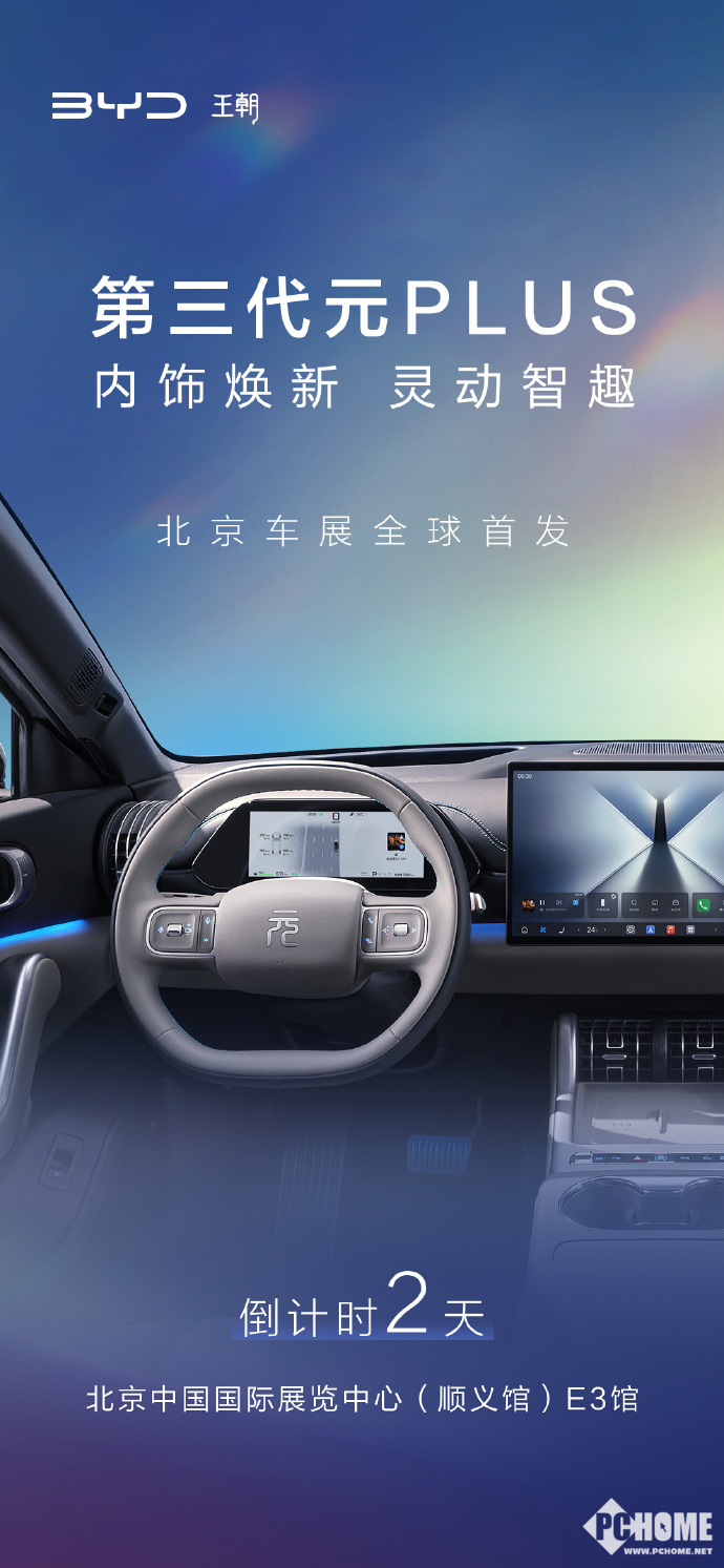 PChome 4月22日消息,比亚迪第三代元PLUS车型将于2026北京车展全球首发,定位“元力智趣闪充SUV”,目前官方放出了该车的内饰官图。